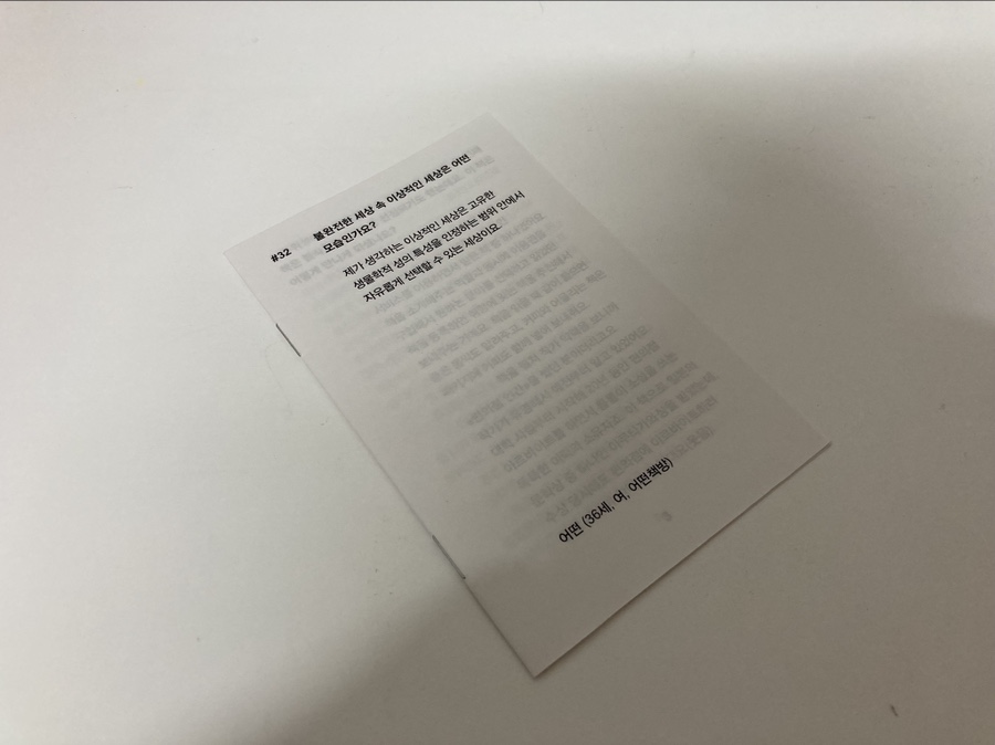 목차 구성도 전혀 보이지 않고, 책을 싼 포장지를 통해 그 질문에 대한 호기심과 그 질문을 던진 첫 번째 기고자의 간략한 인터뷰 용지가 들어 있었습니다.